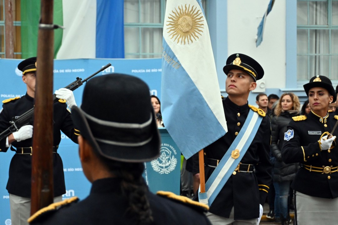 El acto se realizó frente a la Jefatura de la Policía de Río Negro y fue encabezado por la gobernadora Carreras que dijo "cuando hablamos de la bandera, hablamos de educación como ustedes que están transitando un proceso educativo".