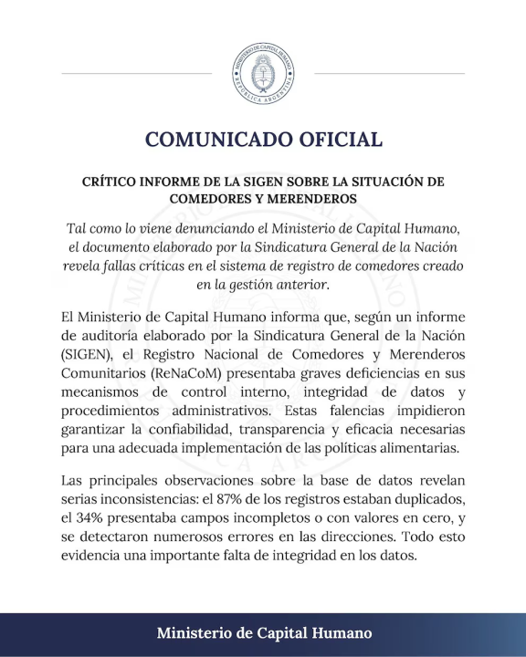 A través de la secretaría nacional de la Niñez, Adolescencia y Familia, el Ministerio de Capital Humano de la Nación eliminó el Registro Nacional de Comedores y Merenderos Comunitarios de Organizaciones de la Sociedad Civil (RENACOM). Con esto cambia el esquema de control y asignación de recursos para estos espacios. La Resolución 393/2025, publicada en el Boletín Oficial y firmada por Juan Bautista Ordoñez, sostiene que este cambio permite la gestión «más eficiente y transparente de la asistencia alimentaria».
