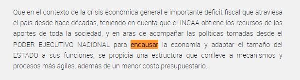 Entre los considerando que argumentan la medida puede leerse textual el siguiente párrafo: «Que en el contexto de la crisis económica general e importante déficit fiscal que atraviesa el país desde hace décadas, teniendo en cuenta que el Incaa obtiene los recursos de los aportes de toda la sociedad, y en aras de acompañar las políticas tomadas desde el PODER EJECUTIVO NACIONAL para encausar la economía y adaptar el tamaño del ESTADO a sus funciones, se propicia una estructura que conlleve a mecanismos y procesos más ágiles, además de un menor costo presupuestario».