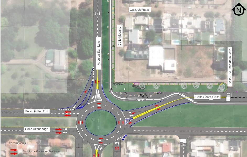 En ese esquema, Santa Cruz pasó a tener sentido único este–oeste entre San Luis y la Ruta 151, mientras que Azcuénaga quedó habilitada con circulación oeste–este, disposiciones que continúan vigentes.