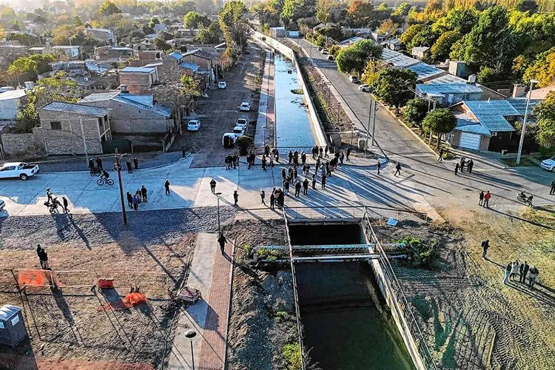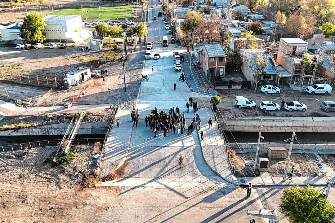 La sistematización del arroyo Durán con el puente terminado, permitirá unir los barrios Don Bosco II y Altos del Limay. Gaido destacó la conectividad de las avenidas que comprometió para 2025. La obra es de Recursos Hídricos con financiamieto de la UPEFE