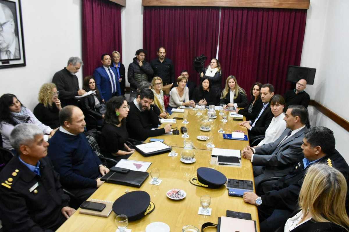 La amplia mesa se reunió este martes a la mañana en la Casa de Gobierno. Los anfitriones fueron la ministra de Desarrollo Humano, Gobiernos Locales y Mujeres, Julieta Corroza; el ministro de Seguridad, Matías Nicolini; y el de Trabajo, Lucas Castelli. Asistieron representantes de las áreas de salud, educación, obras públicas y planificación. También el subjefe de la Policía provincial, Walter San Martín.