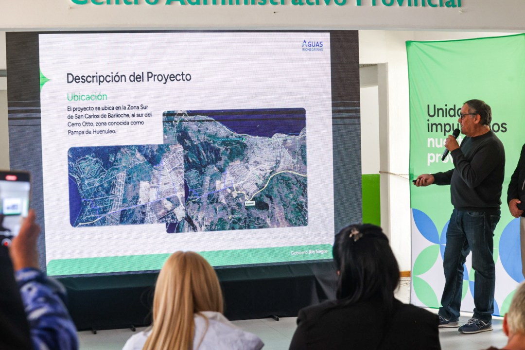 Iud presentó el proyecto en una pantalla gigante y dijo que la magnitud de la toma de agua del Gutiérrez se compara con la que se concretó en el año ’95 en el Nahuel Huapi y que hoy abastece a la mayor parte de la ciudad.