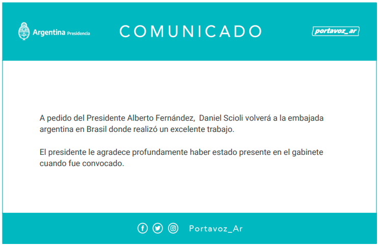 «A pedido del presidente Alberto Fernández, Daniel Scioli volverá a la embajada argentina en Brasil donde realizó un excelente trabajo», informaron en el comunicado oficial.