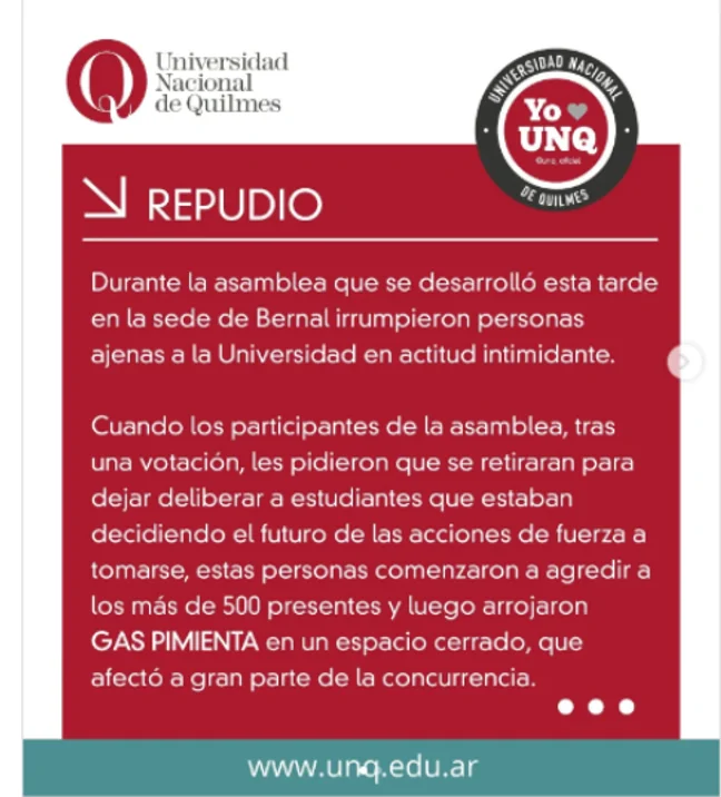 Estudiantes y docentes de la Universidad Nacional de Quilmes denunciaron que un grupo de personas infiltradas tiraron gas pimienta en una asamblea de estudiantes. Afirmaron que representaban a La Libertad Avanza.