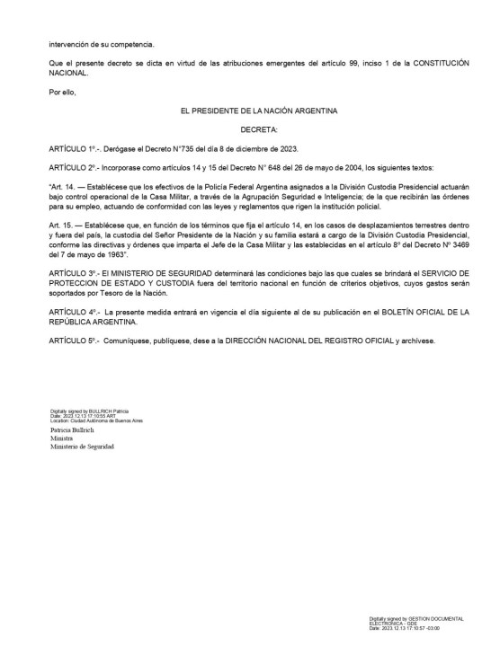 “Se derogó el Decreto N°735 del día 8 de diciembre de 2023 firmado por el ExPresidente Alberto Fernández, que determinaba la obligatoriedad del Estado argentino de brindarle custodia tanto a él como a sus familiares directos, aun viviendo en el exterior, lo que implicaba la reestructuración de cuestiones operativas y presupuestarias que resultan contrarias al uso eficiente de los recursos y el erario público, en detrimento de las políticas impulsadas por el Estado Nacional”, dijo además un comunicado oficial del ministerio de Seguridad.