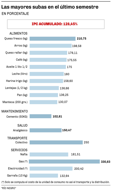 En Río Negro esos guarismo son del 128,45% en los últimos seis meses, del 300,72% entre junio de 2023 y mayo de 2024, y del 49,23% en el primer trimestre de este año, de acuerdo a los datos de la Dirección de Estadística y Censos.