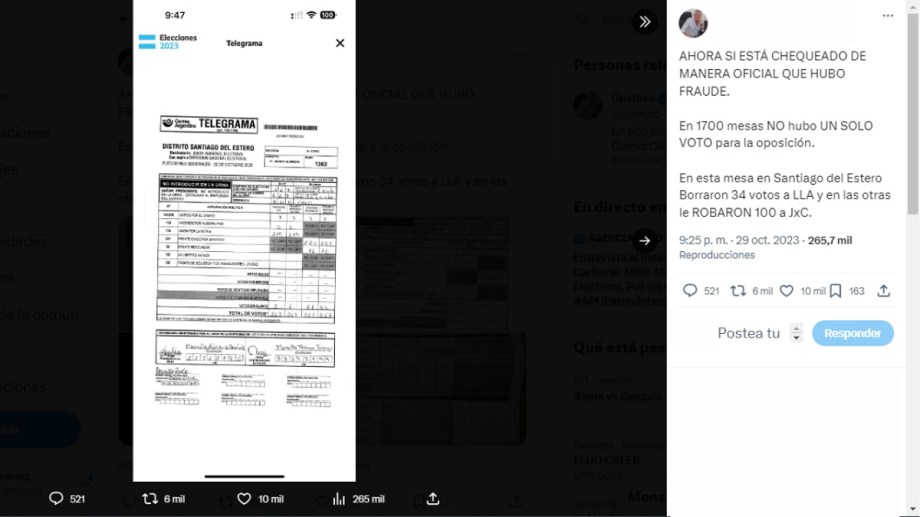 Luego de las elecciones generales del 22 de octubre, aparecieron supuestas denuncias por fraude en redes sociales. Comenzaron a viralizarse fotos de telegramas con cero votos para Javier Milei, lo cual despertó la indignación inmediata entre los simpatizantes de La Libertad Avanza.