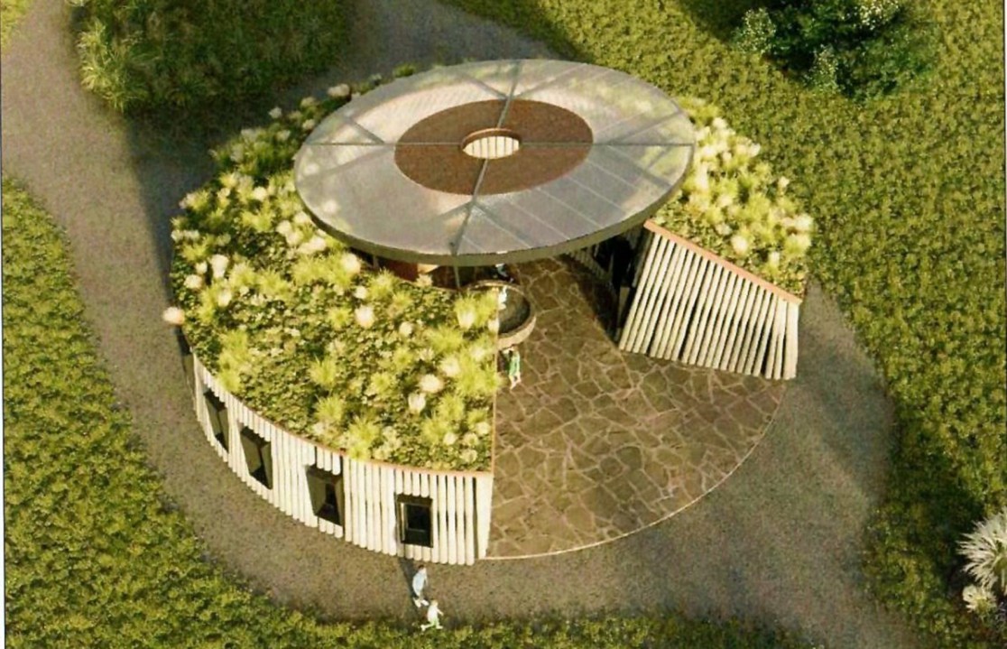 El observatorio mapuche, con fogón y techo verde