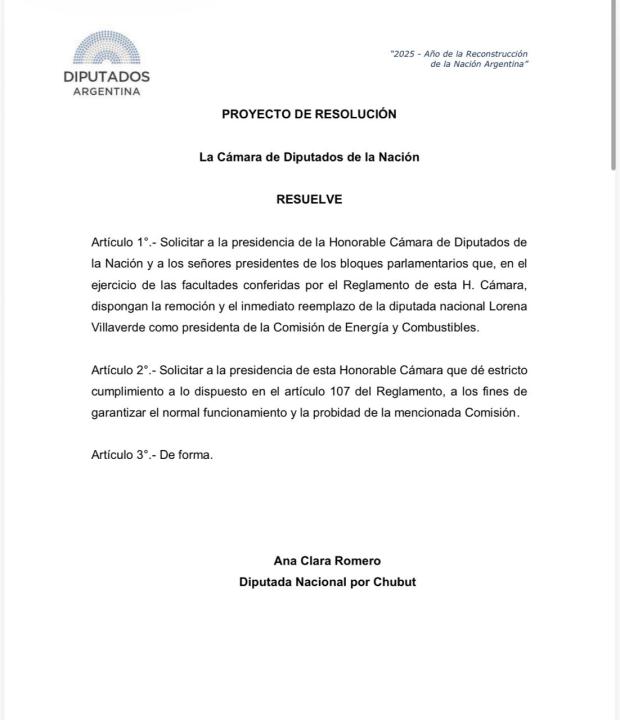 Los pedidos formales tienen por un lado a la diputada nacional del PRO representante de Chubut, Ana Clara Romero, y el parlamentario socialista de Santa Fe, Esteban Paulón, que plantearon desplazar a la rionegrina de la presidencia de la comisión de Energía y Combustibles.