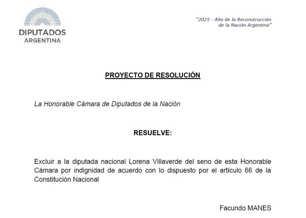 Por otro lado, el exdiputado y actual candidato a senador Facundo Manes también hizo público un proyecto de resolución presentado, pero en su caso solicita la remoción de Villaverde de la Cámara de Diputados.