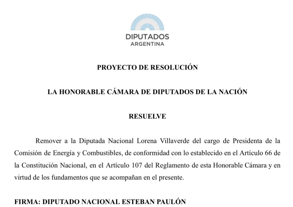 Paulón presentó un proyecto de resolución para “remover” a Lorena Villaverde de la presidencia de la comisión amparándose en el artículo 66 de la Constitución Nacional que establece que con los dos tercios de los votos la Cámara podrá “corregir a cualquiera de sus miembros por desorden de conducta en el ejercicio de sus funciones, o removerlo por inhabilidad física o moral sobreviniente a su incorporación, y hasta excluirle de su seno”.