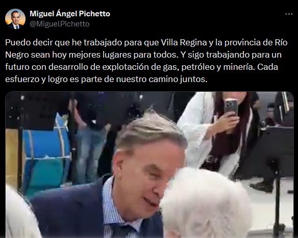 Agregó que nadie puede negarle a Pichetto «todo lo que ha hecho por Río Negro. Quién puede negar su bregar por las economías regionales, la realización de Obra Pública, el respaldo a cuestiones medulares como el GNL o el Oleducto y la creación de algo tan importante como la Universidad Nacional de Río Negro», por eso pidió que «sea candidato a Senador por nuestra provincia en las próximas elecciones».