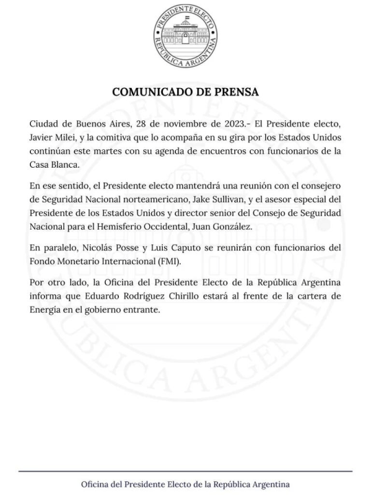 “La Oficina del Presidente Electo de la República Argentina informa que Eduardo Rodríguez Chirillo estará al frente de la cartera de Energía en el Gobierno entrante”, publicó en la red social X (ex Twitter) la oficina que publica datos sobre Milei. En el comunicado además hubo detalles sobre la gira que lleva en estos momentos por Estados Unidos el próximo mandatario.