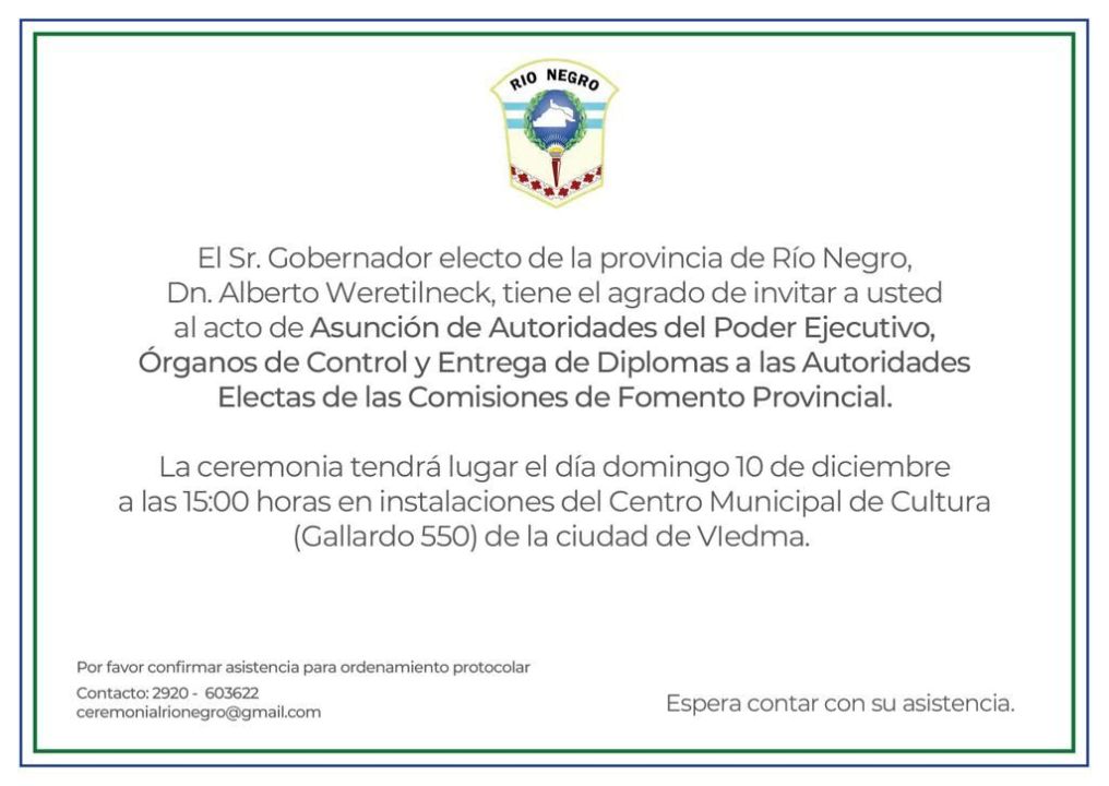 Alberto Weretilneck asumió hoy su tercer mandato como gobernador constitucional de Río Negro. Por la tarde, asumieron sus ministros y se entregaron certificados a las autoridades de las Comisiones de Fomento en un acto en el Centro Cultural de Viedma. El último acto fue en la Escuela de Cadetes de Río Negro, donde asumió la Jefa de Policía de Río Negro, Mary Carmen Carrizo.