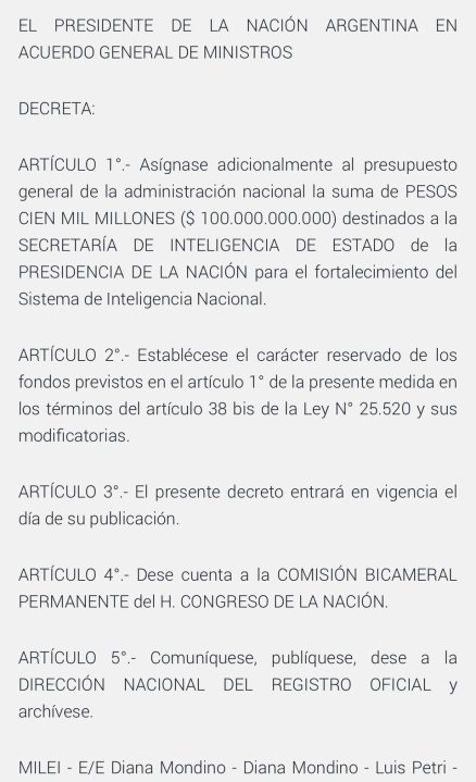 A través del decreto de necesidad y urgencia 656 publicado este martes en el Boletín Oficial, el Presidente dispuso que esa estructura cuente con 100 mil millones de pesos de presupuesto.  «Resulta necesario asignar las partidas presupuestarias que permitan solventar, inicialmente, las acciones para la reorganización del Sistema de Inteligencia Nacional y el adecuado funcionamiento de los referidos organismos desconcentrados que lo integran», argumenta el texto del DNU.
