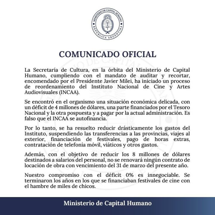 El gobierno de Javier Milei tomó una nueva resolución con los recortes que se aplicarán en el Instituto Nacional de Cine y Artes Audiovisuales (INCAA). Publicada en el Boletín Oficial con el título de «Suspensión de Erogaciones Económicas en el marco de racionalización de recursos», comprendida en la emergencia pública que se enumeró en el mega DNU 70.