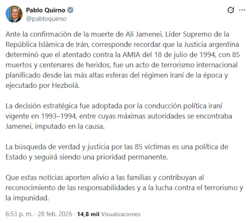 “Ante la confirmación de la muerte de Ali Jamenei, Líder Supremo de la República Islámica de Irán, corresponde recordar que la Justicia argentina determinó que el atentado contra la AMIA del 18 de julio de 1994, con 85 muertos y centenares de heridos, fue un acto de terrorismo internacional planificado desde las más altas esferas del régimen iraní de la época y ejecutado por Hezbollah“, escribió el canciller al principio de su mensaje.