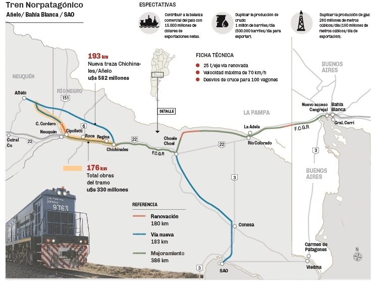 La iniciativa incluye la intervención de un total de 653 kilómetros de vías, entre ellos incluye una vía nueva entre Cinco Saltos (cerca de a Contralmirante Cordero) y Añelo, la intervención de la vía existente entre Cerri – Cipolletti – Cinco Saltos; la ejecución de una nueva vía de acceso al puerto Empalme Aguará–Galván; el acceso a puerto Galván de Bahía Blanca; playas de maniobra en las terminales y la construcción de desvíos de cruce.