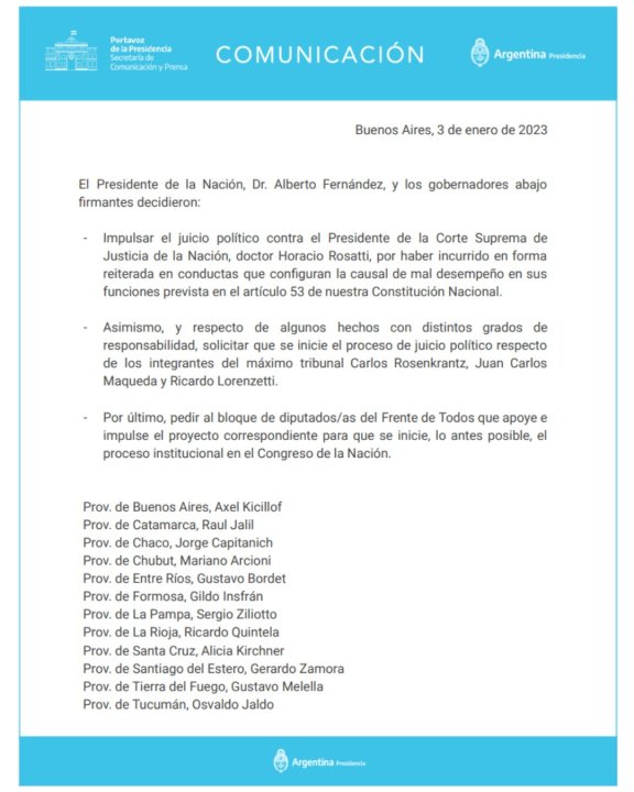 «Junto a gobernadores y gobernadoras hemos tenido una reunión con el señor presidente con el objetivo de propiciar la firma de un pedido de juicio político en el marco del artículo 53 de la Constitución Nacional, en virtud del mal desempeño de funciones de los cuatro jueces de la Corte Suprema de Justicia», indicó Capitanich durante una conferencia en la Casa Rosada junto a otros representantes de las provincias.