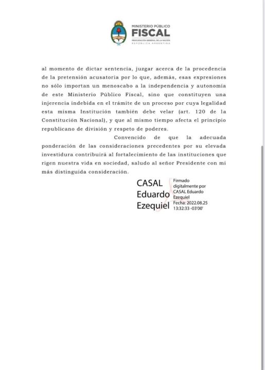 Tras reunirse con Mola y Luciani, Casal afirmó en la carta: “Esas expresiones no sólo importan un menoscabo a la independencia y autonomía de este Ministerio Público Fiscal, sino que constituyen una injerencia indebida en el trámite de un proceso por cuya legalidad esta misma Institución también debe velar (art. 120 de la Constitución Nacional), y que al mismo tiempo afecta el principio republicano de división y respeto de poderes”.