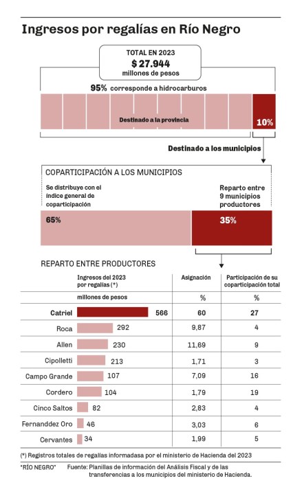 Nueve son productores y, por eso, reciben ingresos extras por regalías. Para el resto, el aporte por ese concepto significa menos del 3% del total de los envíos de coparticipación de la Provincia. Para los estados petroleros, las regalías equivalen hasta el 27% del total, como ocurre con Catriel.