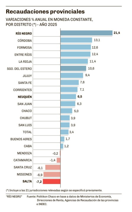 En el 2025, Río Negro lideró la nómina de provincias con mayor recaudación propia
