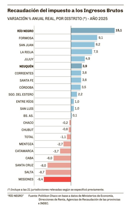 El escrito técnico resalta que los “picos de crecimiento están en Río Negro (15,1% real anual) y en Formosa (9,1%)” frente a las disminuciones más fuertes, estas estuvieron en Salta (- 8,7%) y en Misiones (-9,4%).