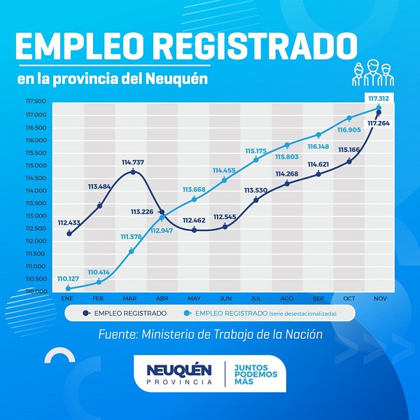 Según el informe mensual del ministerio de Trabajo de la Nación, Neuquén registró en noviembre del año pasado 117.264 trabajadores registradores; un 0,3 por ciento por encima de octubre.
