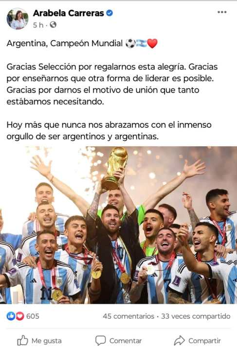 Más temprano, la gobernadora Carreras se sumó a los festejos por las redes por el título de la selección nacional y expresó «Gracias Selección por regalarnos esta alegría. Gracias por enseñarnos que otra forma de liderar es posible. Gracias por darnos el motivo de unión que tanto estábamos necesitando.
