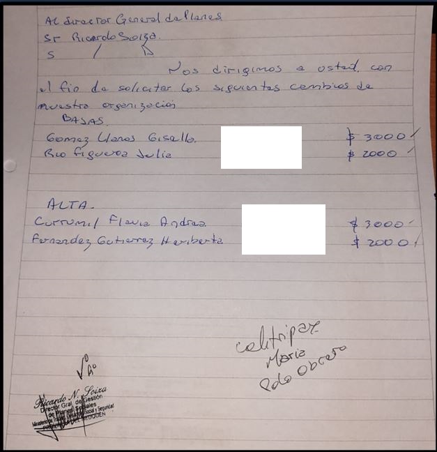 Entre la documentación secuestrada no sólo hay prolijas planillas de Excel: también notas manuscritas dirigidas a Ricardo Soiza para pedir altas y bajas en los subsidios. Parecen un borrador, un apunte precario: «Nos dirigimos a Usted con el fin de solicitar los siguientes cambios en nuestra organización», comienzan.