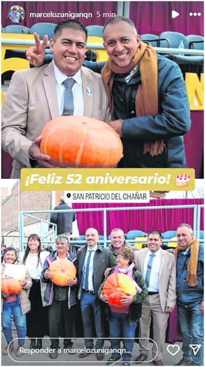 Elsubsecretario de Producción, Marcelo Zúñiga, aprovechó el aniversario de El Chañara para mostrar logros productivos. Se sacó una selfie con el intendente Gonzalo Nuñez (ambos del PJ rolista) donde éste enseña un flor de zapallo. Marcelo aprovechó para hacer el gesto de la victoria…