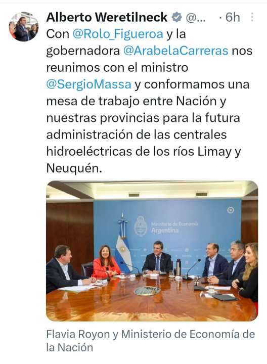 “Con @Rolo_Figueroa y la gobernadora @ArabelaCarreras nos reunimos con el ministro @SergioMassa y…” Así arrancó el tuit del gobernador electo, Alberto Weretilneck, pasado el mediodía del jueves, sobre el encuentro que tuvieron casi un día antes en Buenos Aires por las represas.¿Pero no le faltó algo? Sí, algo (o alguien) importante: el gobernador Omar Gutiérrez también estuvo en la reunión. ¿Ninguneo sin intención?