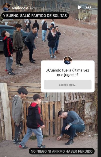 El diputado provincial Francisco Pipi Lepore no se pudo resistir al desafío que le planteó un grupo de chicos de un barrio de Neuquén para ver si era tan ducho en el juego de las bolitas. “No niego ni afirmo haber perdido”, escribió en sus historias de Instagram donde también pidió una retroalimentación con sus 1075 seguidores para saber cuándo fue la última vez que jugaron. Se dice que los chicos del barrio le ganaron haciéndolas chocar.