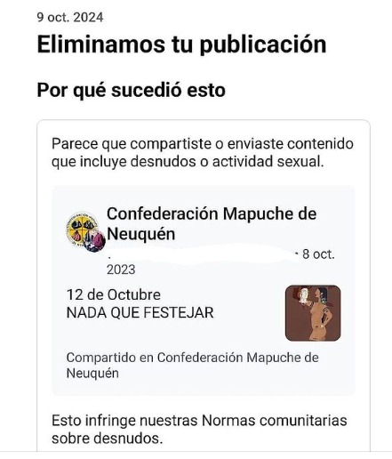 El gigante de la red social Facebook eliminó un mensaje de la Confederación Mapuche porque tenía un dibujo supuestamente de un desnudo femenino. Querían evidenciar el “modus operandi” español del uso sistemático de miles de violaciones y la violencia contra las mujeres indígenas. Pero estaba la norma inviolable.