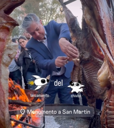 El tema era quién tenía la habilitadad para cortar mientras se termina de asar en el asado y bancarse el calor del fuego. El gobernador Rolando Figueroa hizo gala de su sapiencia. Tomó un cuchillo, generó suspenso, y con una pericia admirable, tomó un pedazo de carne del chivo, entre dos panes y lo cortó sin ningún problema.