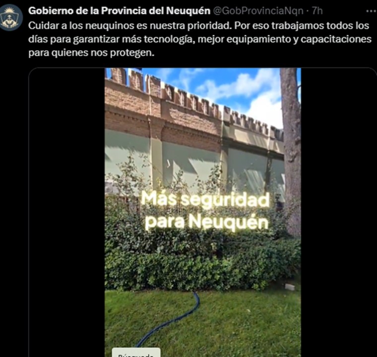 El gobierno de la provincia de Neuquén se devana los sesos para mostrar logros, pero a veces el presupuesto no alcanza. Se publicó un video en redes con los números logrados en tema seguridad: autos nuevos, botones antipánico, etc. Lo hicieron en el patio de la Casa de Gobierno, el lugar más seguro de la Provincia.