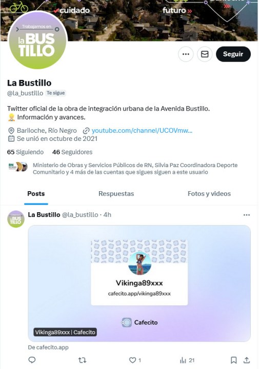La obra de la avenida Bustillo en Bariloche tenía su propia cuenta oficial en Twitter (ahora X) donde informaba el Gobierno las tareas y entre sus seguidores está el exintendente Gennuso, varios ministerios y el cipoleño Rodrigo Buteler. Pero @labustillo tuvo corta vida: se creó en octubre de 2021 y su última publicación fue en diciembre de 2022, un año antes de que termine el gobierno de Arabela Carreras. Sin embargo, esta semana hubo un llamativo movimiento en la red social con el posteo de una imagen, en duplicado, de una presunta aplicación a nombre de “Vikinga89xxx”. ¿Un community manager despistado o hackeo?
