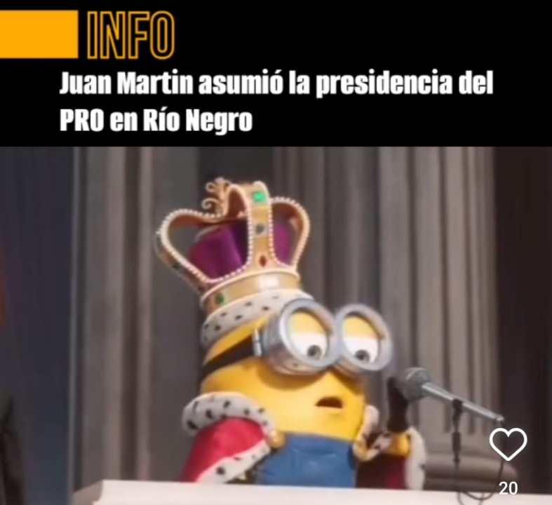 La asunción de las nuevas autoridades del PRO abrió las puertas a la creatividad en el mundo digital. Así fue como apareció el posteo del sitio Infoprorionegro, que contó la llegada de Juan Martin al máximo cargo partidario a partir de una escena de la película Minions, que en su producción inicial del 2015 muestra al “Rey Bob”, en el momento de la coronación en el Palacio de Buckingham.
