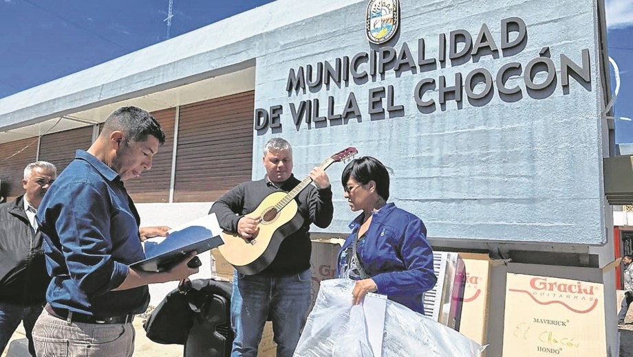 Pablo Di Fonzo, intendente de Villa El Chocón, recibió de l subsecretario de Cultura, Oscar Sarhan una partida de instrumentos musicales para la escuela local. El intendente, contento, dijo que había que probarlos frente al funcionario, por las dudas, de un reclamo. Todo anduvo de diez.