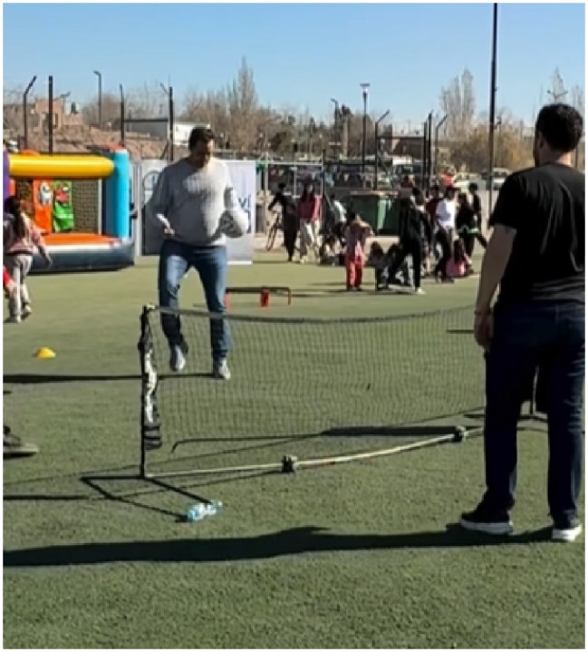 El ministro de Trabajo y Desarrollo Laboral, Lucas Castelli, estuvo en una jornada de recreación en el Parque Industrial de Neuquén y Juan Luis Ousset lo desafío a probar su derecha con la pelota y no es que guau pero se defendió. Le faltó práctica que no podrá tener mucho ahora que tiene dos ministerios.