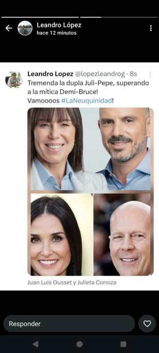 “Tremenda dupla Juli – Pepe, superando a la mítica Demi – Bruce”. Lo escribió el presidente de la Agencia de Inversiones de Neuquén en el lanzamiento virtual de la campaña para entronizar en el senado a Julieta Corroza y Juan Luis Ousset. Dice que superó a la pareja de Holywood Demi Moore y Bruce Willis. Todos suponen por su apariencia…