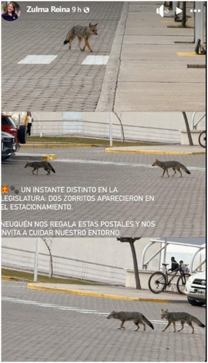 Dos zorros aparecieron en el estacionamiento de la Legislatura de Neuquén. Las imágenes fueron compartidas por la vicepresidenta primera del cuerpo, Zulma Reina, quien destacó el episodio como una postal que invita a reflexionar sobre el cuidado del entorno natural. Hubo bromas porque dijeron que eran “los nuevos”