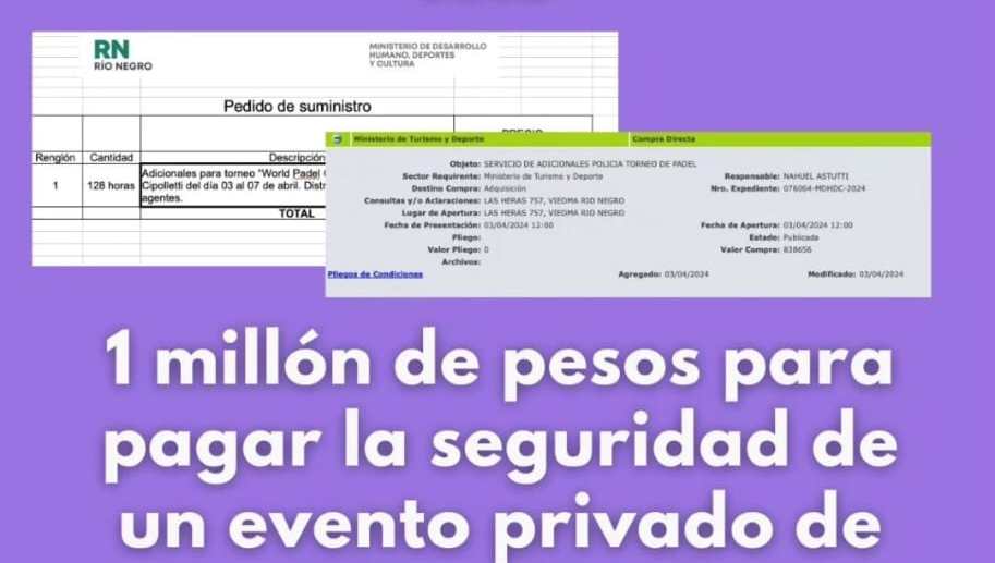 El jueves salieron a las redes remarcando que el gobernador Weretilneck habló de la “dramática crisis financiera” de la provincia, pero al mismo tiempo avanzaba en el área de Deportes, una compra directa para el servicio de adicionales de policía para un torneo de pádel, organizado por una firma privada en Cipolletti. La publicación mostró una erogación prevista por el organismo a cargo de Nahuel Astutti de $838.656.