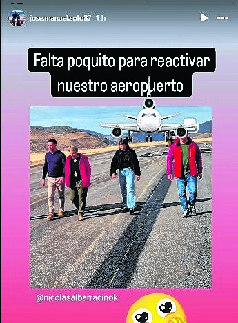 El intendente de Chos Malal, Nicolás Albarracín, fue con los concejales Gimena Vega, Paula Cano y José Soto a recorrer la obra de demarcación que se está realizando en el Aeródromo de la localidad. Hay expectativas en que vuelva a estar operativo para realizar no solo vuelos a vela, sanitarios y el turismo sino para que conecte aviones chicos con capacidad para 46 pasajeros. Al joven edil José Soto s ele ocurrió una forma de impacto para que se tome dimensión de la obra en la que hay sueños de casi todo el norte de Neuquén. Publicó el video de los funcionarios en la pista y de fondo se les viene encima un enorme avión que pareciera que los atropella. Una buena broma.