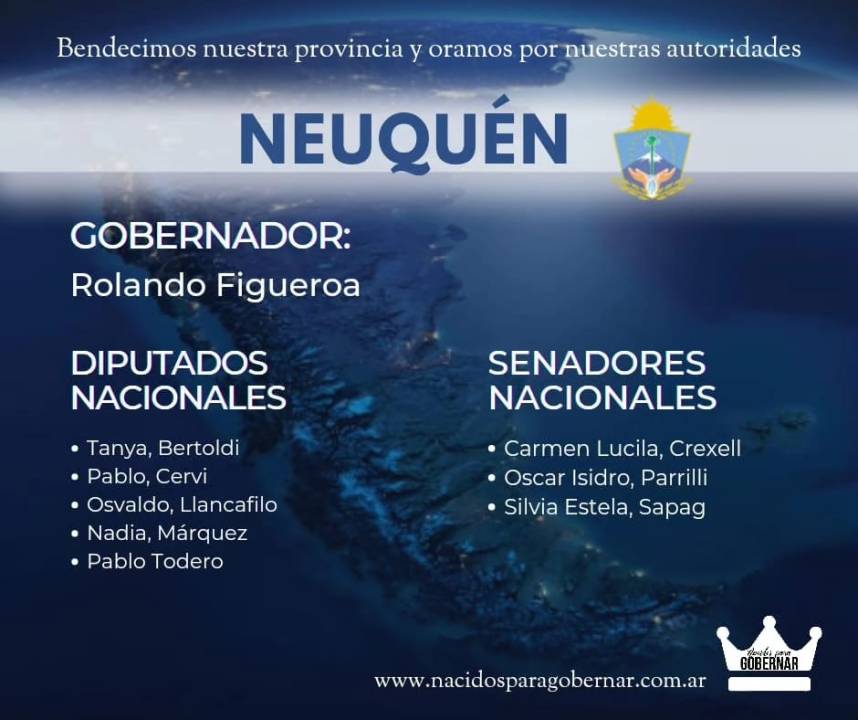 Esta semana Ana Valoy, una conferencista cristiana, llamó a orar por Neuquén, tanto por el gobernador como por sus representantes en el Congreso. La vicegobernadora, Gloria Ruiz, fue la única que lo compartió en sus redes.