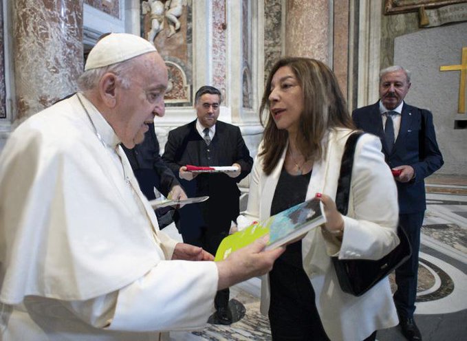 La exgobernador Arabela Carreras recordó en cuenta de cuando estuvo en el Vaticano y le entregó en mano al papa Francisco el proyecto de hidrógeno verde que -según dijo- lo “recibió con alegría”. Un mensaje con doble pedido por la salud de Bergoglio y que saquen del cajón el proyecto!