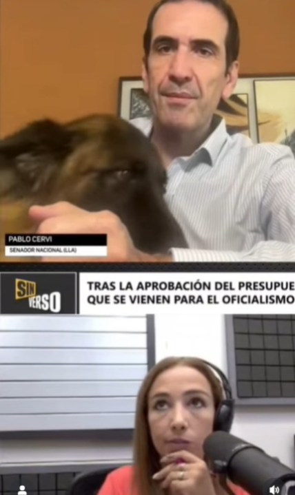 “¡Entrevista en marcha… y miren quien apareció!”, contó el senador nacional Pablo Cervi (LLA) dando lugar a un misterio que se develó a los pocos segundos. La entrevista era por videoconferencia. Le hacían una entrevista desde Ciudadano News de Mendoza, quienes calificó como amigos”. Le hacían la pregunta y habia algo que a Cervi lo incomodaba pero no se veía en la imagen. De pronto apareció un hocico con los dientes afilados mientras el entrevistado intentaba entender la pregunta que le hacían y poner cara de “qué interesante”. “ Sam decidió que también quería salir en la nota. Parece que no se pierde una”, escribió. El can parece acostumbrado a las cámaras. Igual que el perro de Leticia Esteves, Lolo. ¿Habrá competencia?.