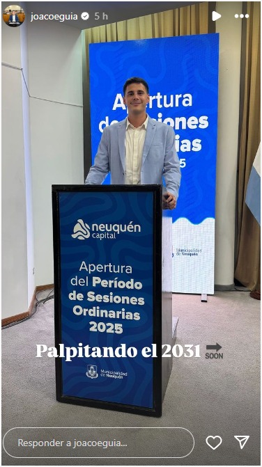 Con sus 25 años, el concejal Joaquín Eguía se probó el atril donde habló el intendente Mariano Gaido y se sacó la foto. Integra la segunda fuerza en cantidad de ediles en el cuerpo deliberativo de la ciudad. En su banca mantiene vigente reclamos a nivel provincial como la mayor seguridad y la desaparición de Luciana Muñoz. Ya se probó el traje para el 31.