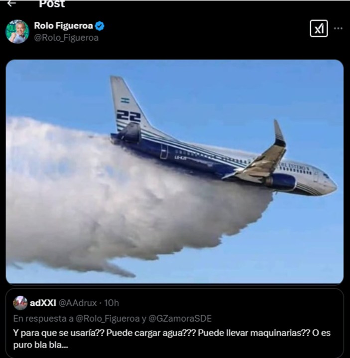Por eso llamó la atención el tono Manuel Adorni con el que respondió a un usuario anónimo. Rolo agradeció al gobernador de Santiago del Estero por prestarle un avión enorme para ayudar a apagar los incendios y el atrevido usuario puso en duda para qué servía porque en el posteo no se lo veía en acción. Rolo publicóla foto del Boeing arrojando agua hacia el bosque. Fin.